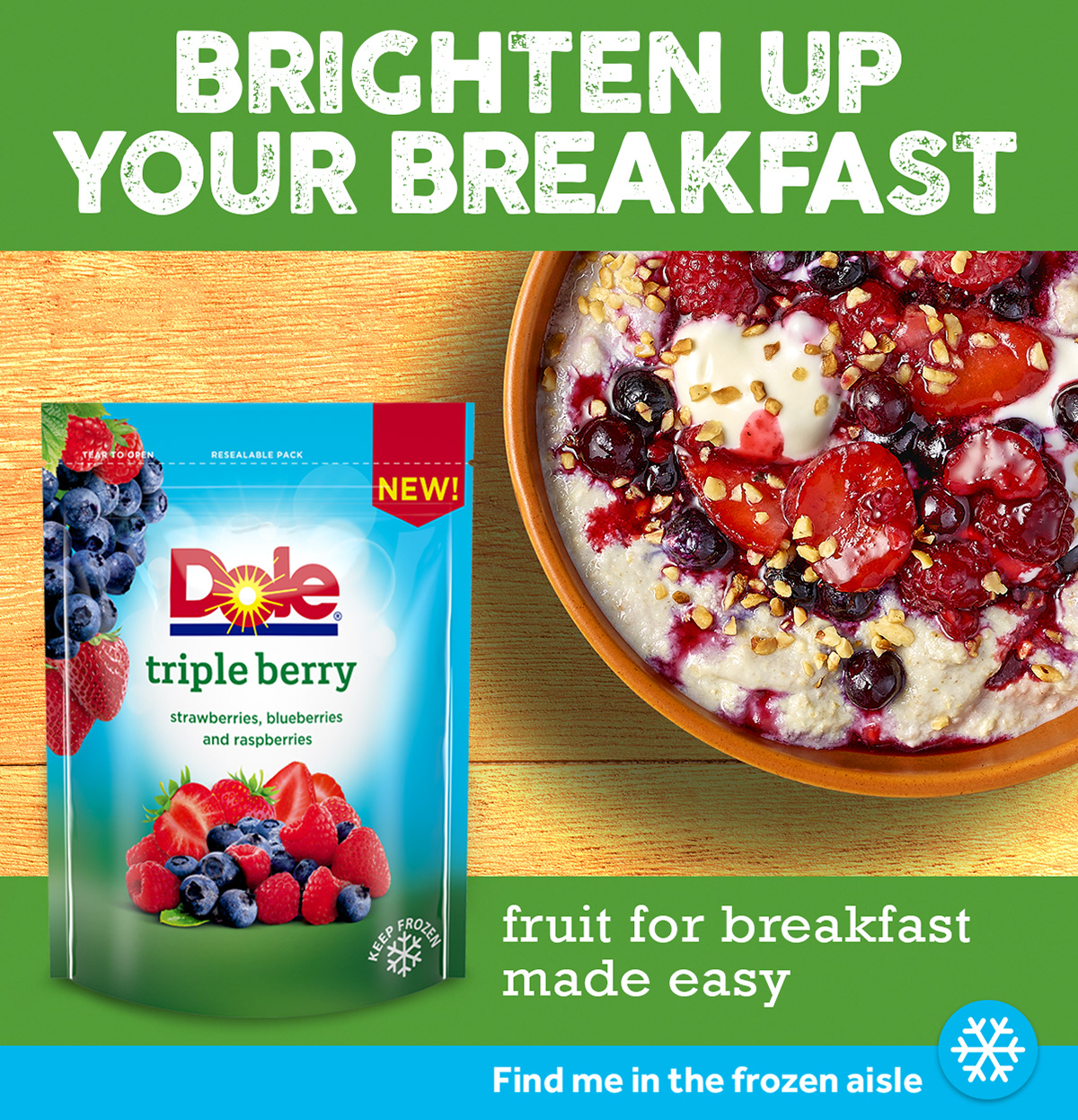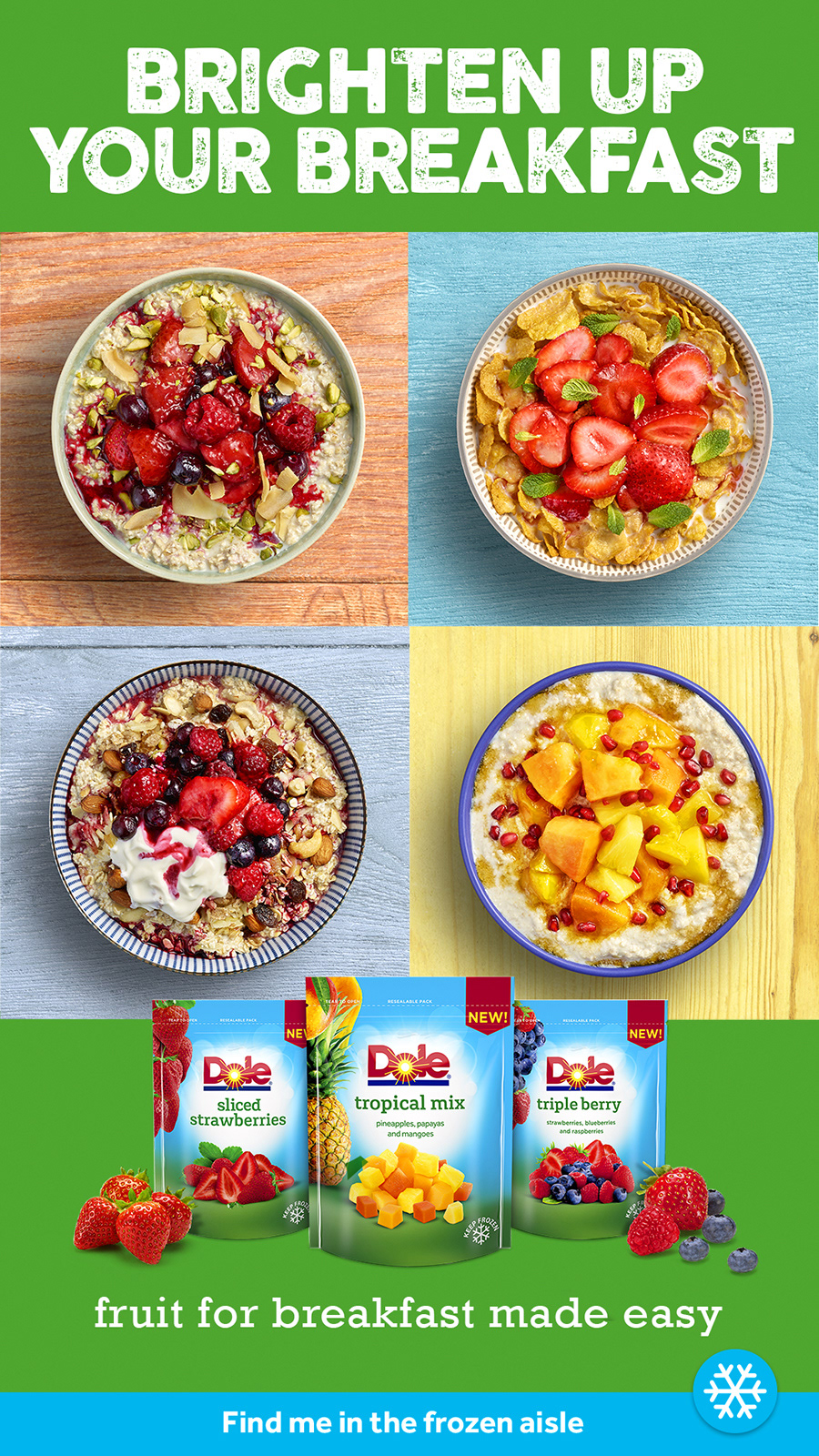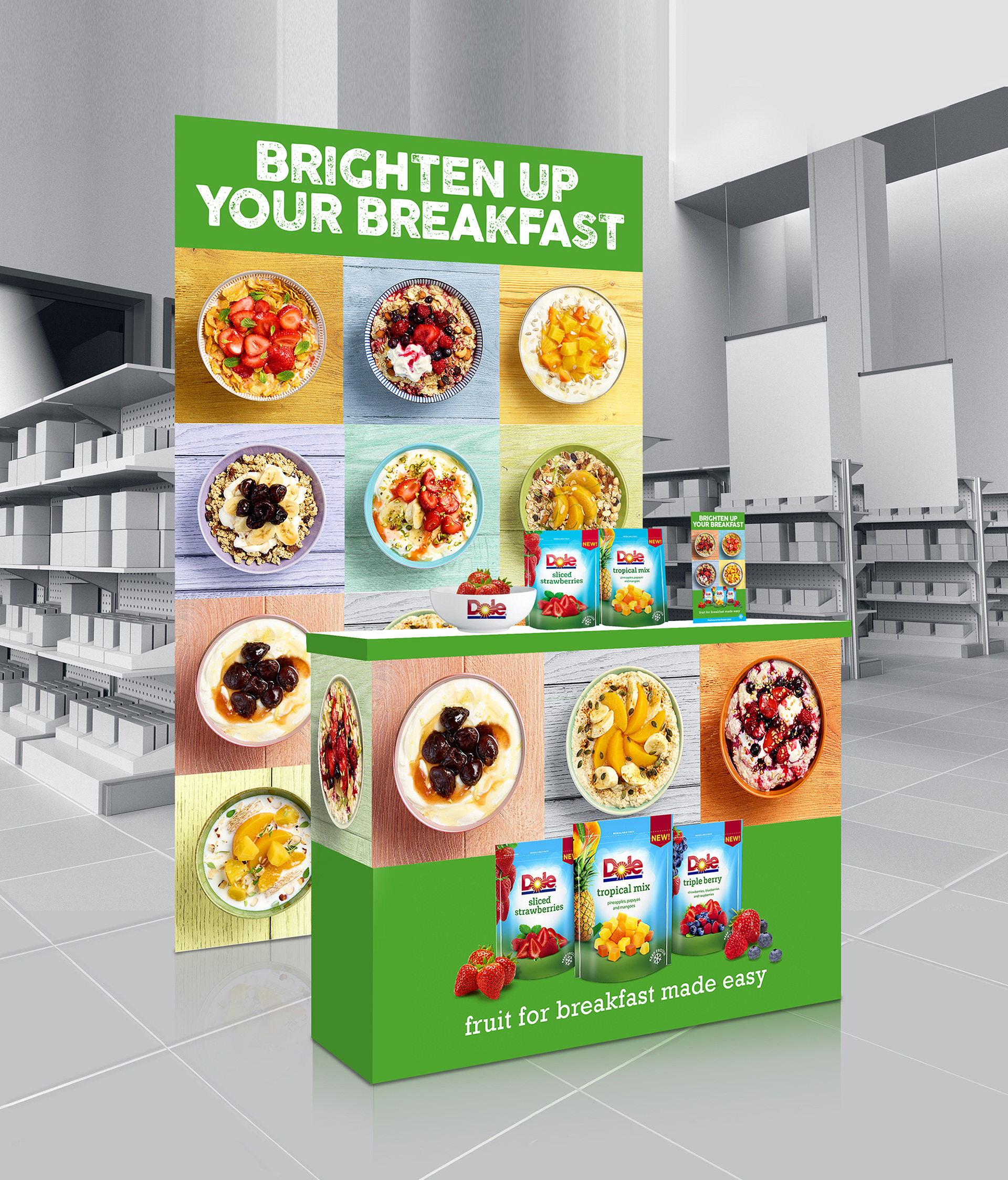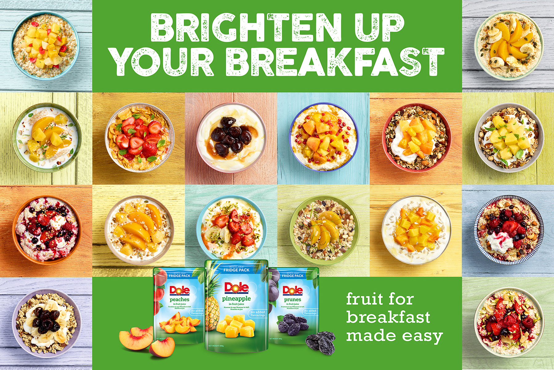 Concept and art direction for campaign 'Brighten up your breakfast' for a relaunch of Dole fruit range. The campaign design to highlight the freshness and easy of product at a busy breakfast time.